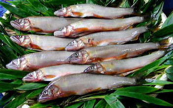 釣った天然鮎は、1晩水槽で泳がせて胃の中の苔を消化させてから生のままチルド便にてお届けします。