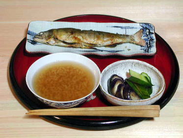 鮎の塩焼き、おかいさん(茶粥)、なすときゅうりの浅漬け。熊野地方のもっとも一般的な鮎の食べ方です。鮎とおかいさん、なすやきゅうりの浅漬けが、たいへんよく合います。 |