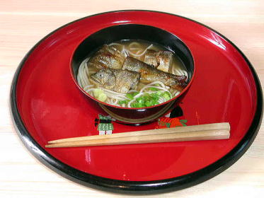 鮎をよく焼いて出汁をとったそうめんです。熊野地方の夏の食卓には必ず登場します。左画像の鮎は、わかりやすいように少し多く入れています。 |