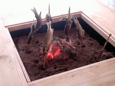 左画像にて鮎を焼いている囲炉裏は、当店にて販売しております。ご興味のある方は、こちらからどうぞ。